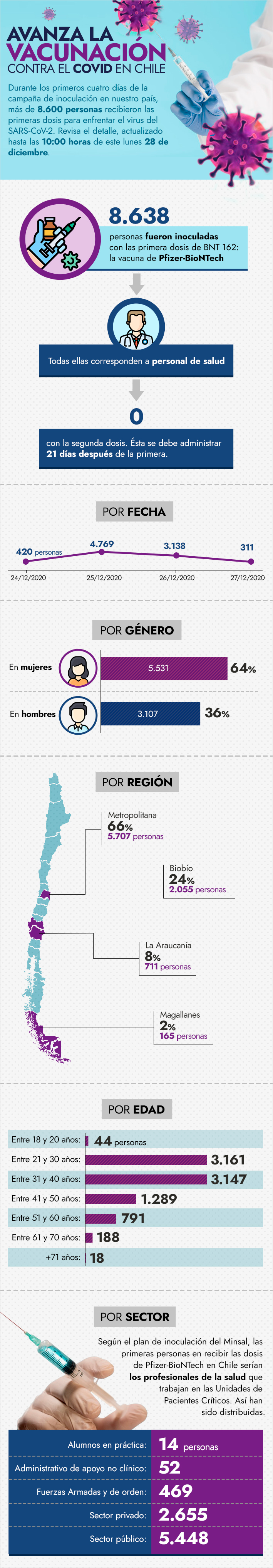 Según las cifras del Departamento de Estadísticas e Información de Salud (DEIS), hasta este lunes en la mañana, el 66% de los funcionarios sanitarios que recibieron las primeras dosis trabajan en la RM. La mayoría de ellos ejerce en el sector público, son mujeres y son menores de 30 años.