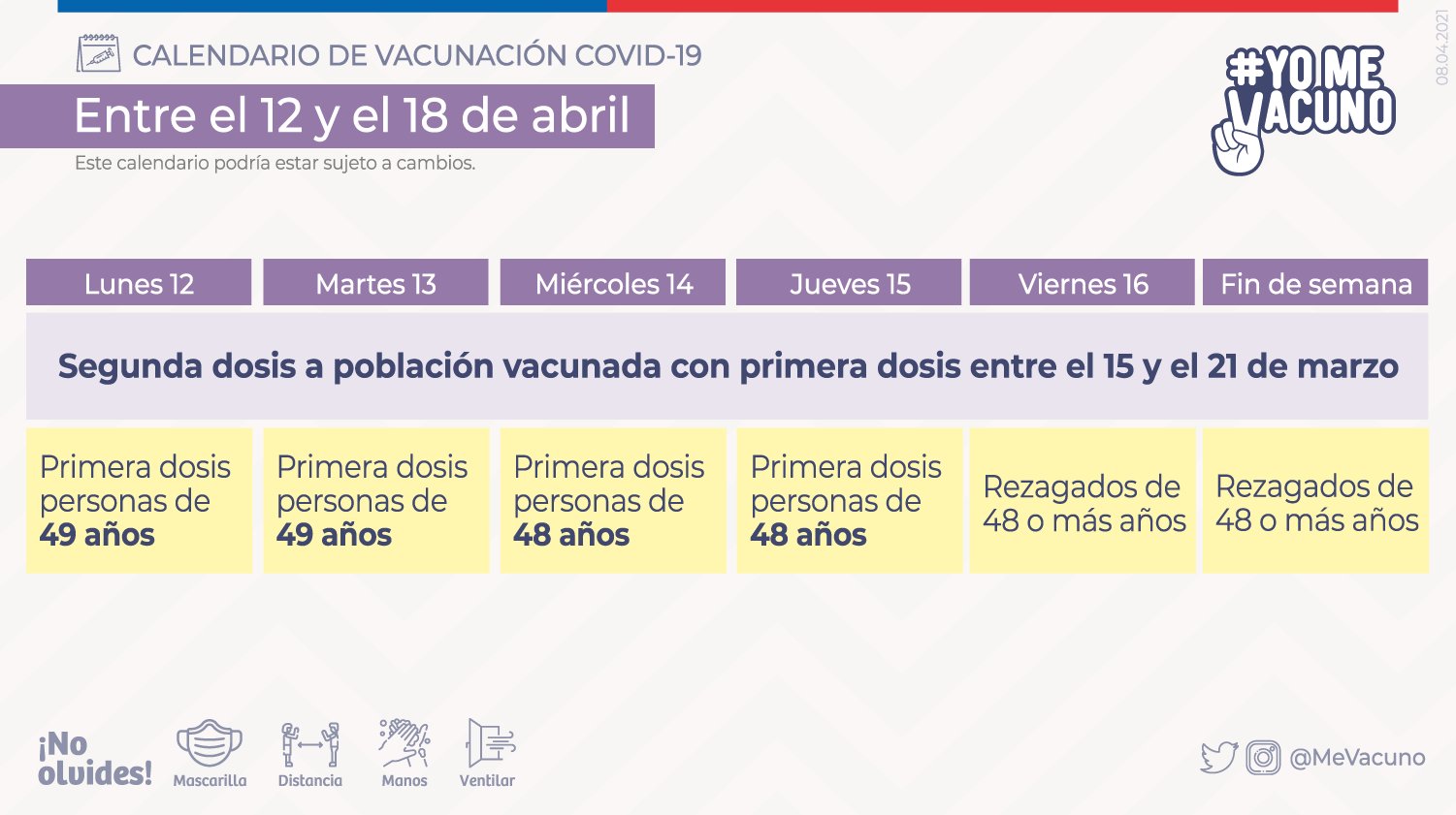 El Ministerio de Salud (Minsal) publicó esta mañana en calendario de vacunación contra el covid-19 correspondiente a la próxima semana, en la cual será el turno de la primera dosis para personas de entre 49 y 48 años de edad.