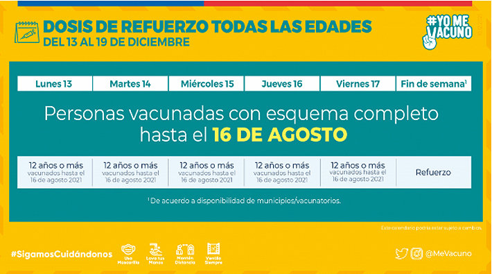 Sobre la dosis de refuerzo, el Minsal detalla que se le inyectará a personas mayores de 12 años que hayan completado su pauta hasta el 16 de agosto.