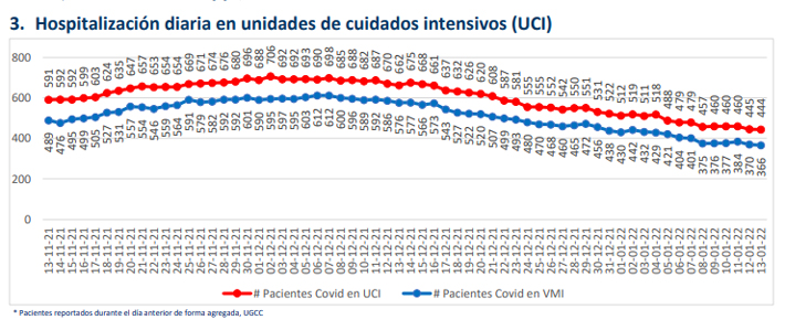 El Minsal informó además que 444 personas se encuentran hospitalizadas en Unidades de Cuidados Intensivos (UCI), mientras que el jueves pasado se contabilizaban 479. De ellas 366 están con apoyo de ventilación mecánica versus los 404 de hace siete jornadas.