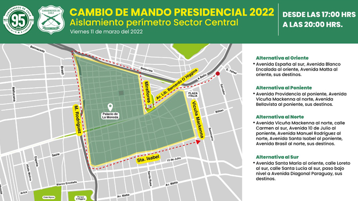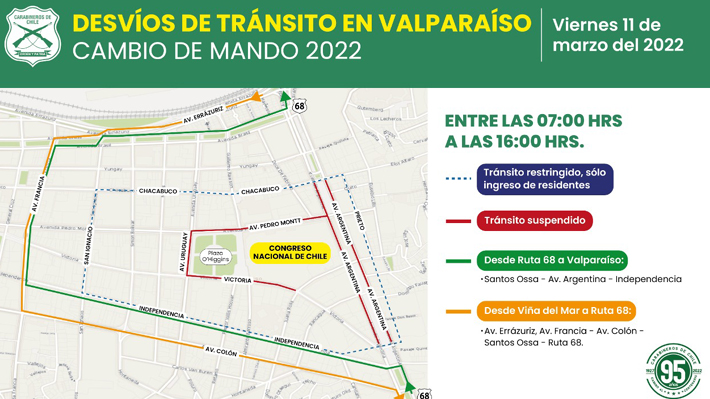 Este próximo viernes 11 de mando se desarrollará en el Congreso Nacional la ceremonia oficial de cambio de mando presidencial, actividad que implicará una serie de desvíos de tránsito en las ciudades de Valparaíso y Santiago. Esto, según informó Carabineros, con el propósito de reforzar la seguridad, tanto de las autoridades como de la comunidad, además de facilitar los desplazamientos de los usuarios de las vías.