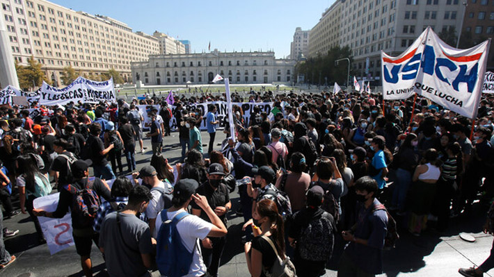 Estudiantes durante la manifestación de hoy mientras pasaban por fuera del Palacio de La Moneda.