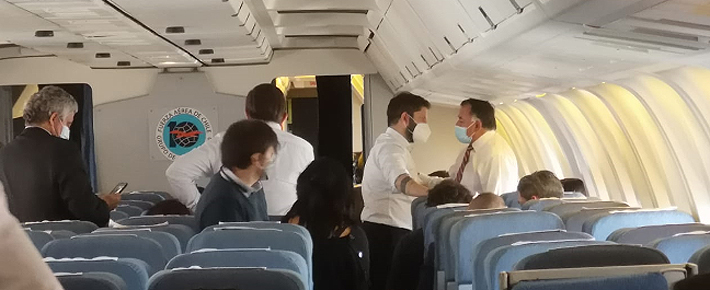 Tras ser recibido en la nave, el Mandatario saludó afectuosamente a todos los miembros de la delegación, tanto a los representantes del empresariado como a los parlamentarios que se sumaron a la gira, con especial énfasis al presidente de la Cámara de Diputados, Raúl Soto, y al jefe de la bancada de la DC, Eric Aedo.