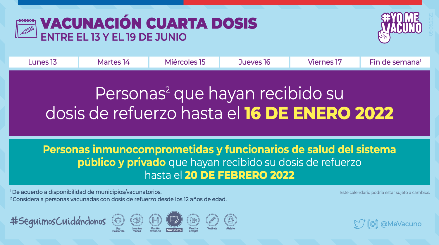 Junto con lo anterior, esta semana, que comprende desde el lunes 13 hasta el domingo 19 de junio, se vacunará a las personas inmunocomprometidas que hayan recibido su dosis de refuerzo hasta el