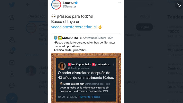 Dicho tweet fue compartido en la cuenta de Sernatur, con la consifna "!Paseo para tod@s!" e invitando a buscar el suyo en la página de viajes para la tercera edad. Publicación que más tarde fue borrada.
