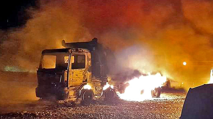 ocho camiones destruidos en un predio forestal perteneciente a la empresa AnChile. Según conoció este medio, un grupo de encapuchados ingresó portado armas de fuego, intimidaron a los trabajadores y luego prendieron fuego a la maquinaria.