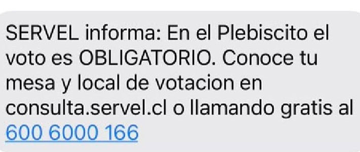 Con el objetivo de aumentar las vías de información durante esta semana previa al Plebiscito de salida, el Servicio Electoral (Servel) enviará mensajes SMS a más de 21 millones de teléfonos móviles del país, recordando que el voto es obligatorio y llamando a las personas a revisar sus datos electorales.