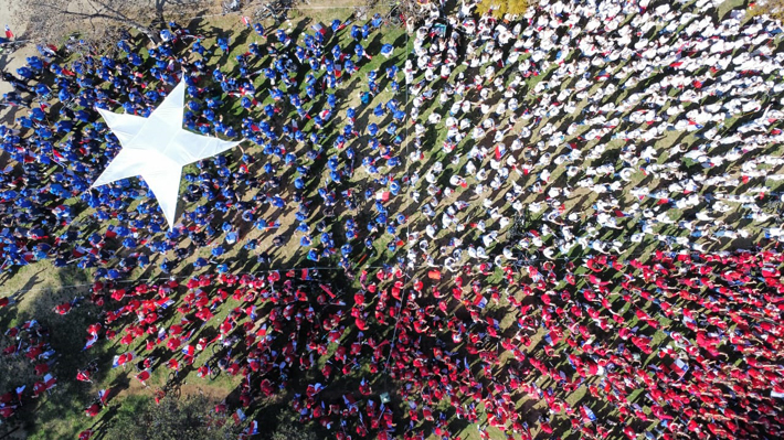 "Miles de personas vestidas de blanco, azul y rojo se reúnen a formar una gran bandera Chilena, bandera que representa la unión y la esperanza para todos los chilenos. Todos juntos cantaron el Himno Nacional", señalaron los organizadores.