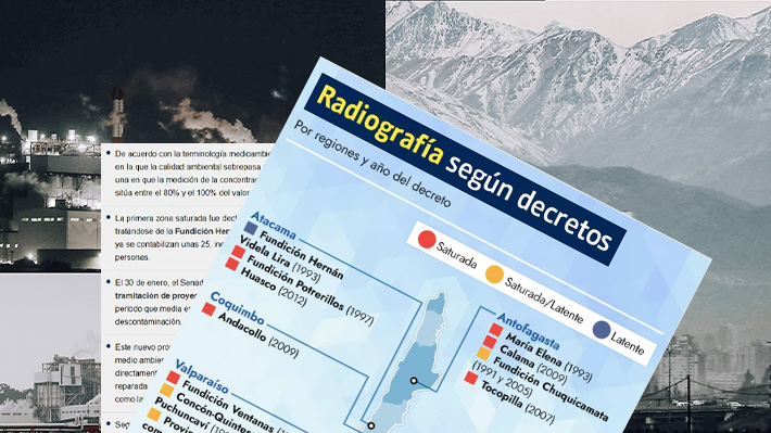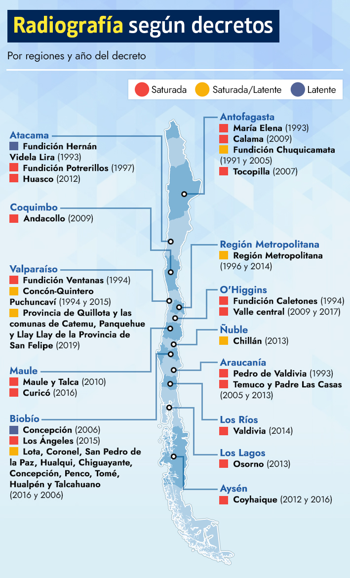 La primera zona saturada fue declarada en 1993 al interior de la Región de Atacama, tratándose de la Fundición Hernán Videla Lira por exceso de anhídrido sulfuroso. A la fecha ya se contabilizan unas 25, incluyendo toda la capital, y en ellas viven cerca de 11 millones de personas.