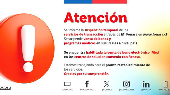 "Estamos presentando problemas con nuestros servicios de transacción digital presentes en la sección MI FONASA de http://fonasa.cl y con la venta de bonos y programas médicos en sucursales a nivel país", señala el organismo en su cuenta de X.