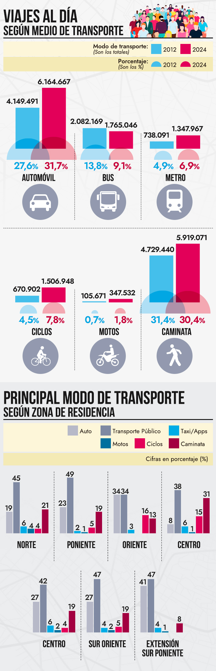 A partir de las cifras entregadas, los desplazamientos en auto aumentaron de 4.1 millones en 2012 a 6.1 millones este año, contrario fue el uso de los buses, que de dos millones de viajes pasaron a 1.7 millones de viajes al día.