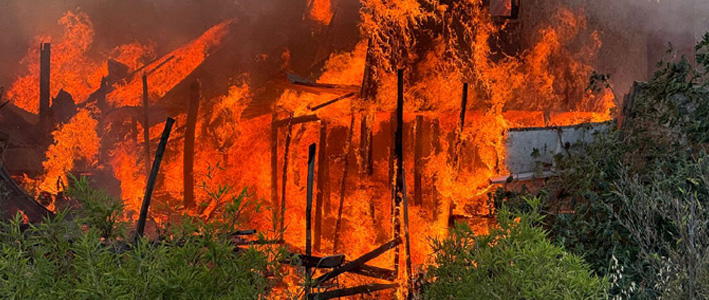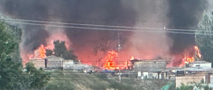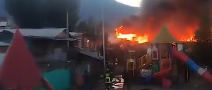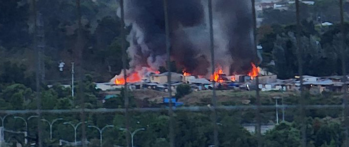 Voluntarios de Bomberos combaten esta mañana un voraz incendio que afecta al Campamento Dignidad, emplazado en la comuna de La Florida, Región Metropolitana.