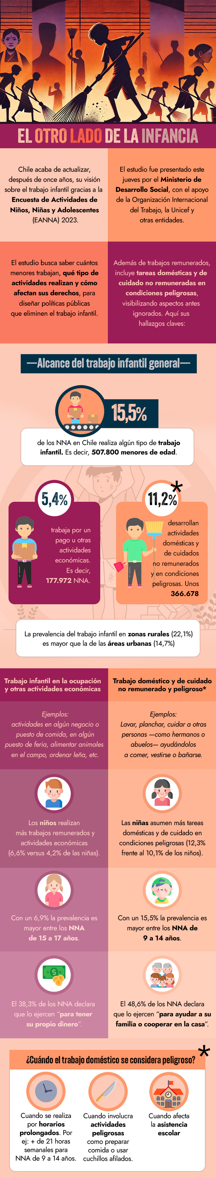 El Ministerio de Desarrollo Social presentó un estudio que actualiza cifras de menores involucrados en labores que comprometen sus derechos. El sondeo incluye —por primera vez— actividades domésticas y de cuidado en condiciones riesgosas, que pueden vulnerarlos cuando se ejercen muchas horas o descuidan el colegio.