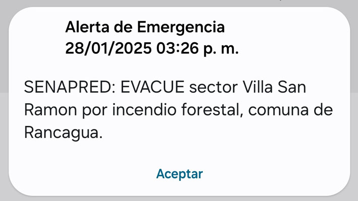 El comunicado informa que se declaró Alerta Roja para la zona, que tiene una superficie afectada de 2,87 hectáreas. Además, para reforzar el retiro de la población de la zona, se activó la mensajería del Sistema de Alerta de Emergencia (SAE).