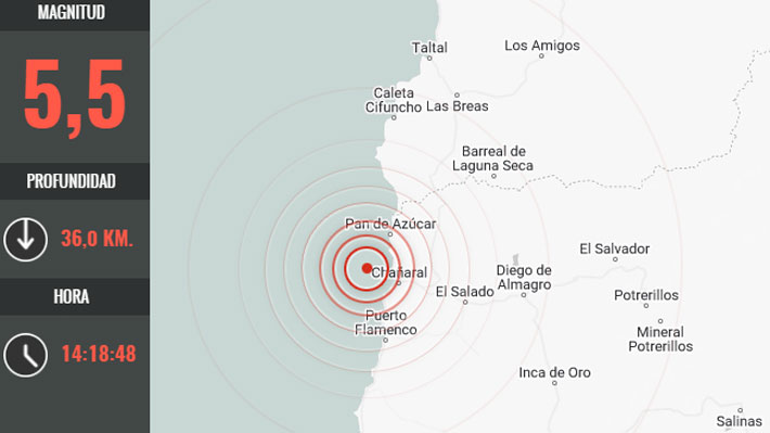 De acuerdo al primer reporte del Servicio Sismológico Nacional fue de 5,5 Richter y su epicentro 15 kilómetros al Noroeste de Chañaral.