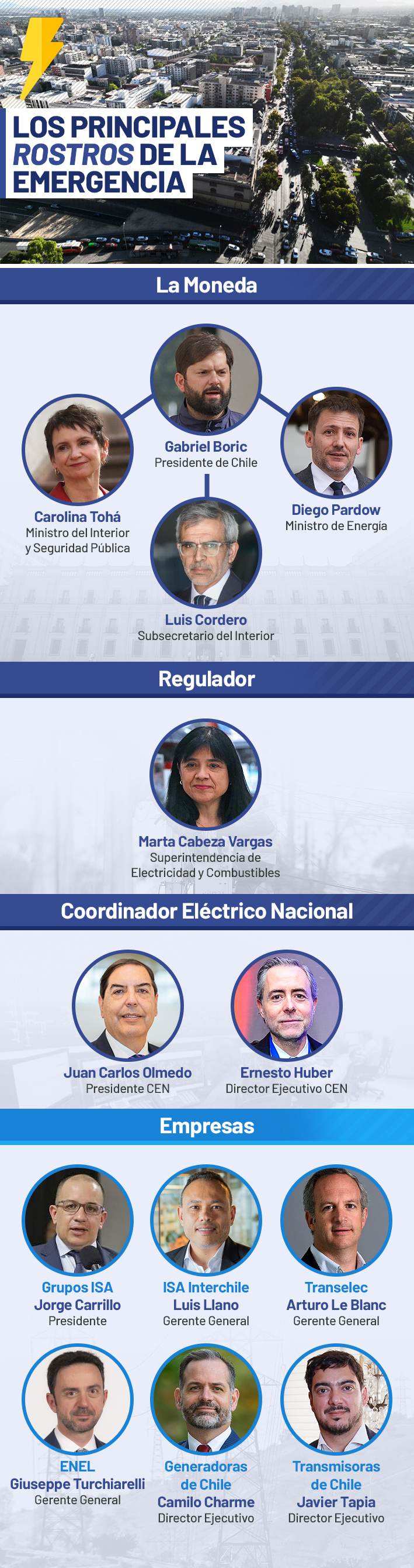 Tras el masivo corte de energía que afectó a más de 8 millones de clientes entre las regiones de Arica y Los Lagos, varias figuras de la esfera pública y empresarial han resaltado por sus intervenciones, y también por su presunta responsabilidad en el apagón.