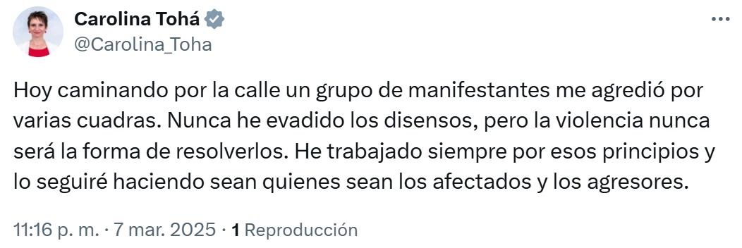 "Hoy caminando por la calle un grupo de manifestantes me agredió por varias cuadras. Nunca he evadido los disensos, pero la violencia nunca será la forma de resolverlos", señaló Tohá en su cuenta oficial de X (exTwitter).