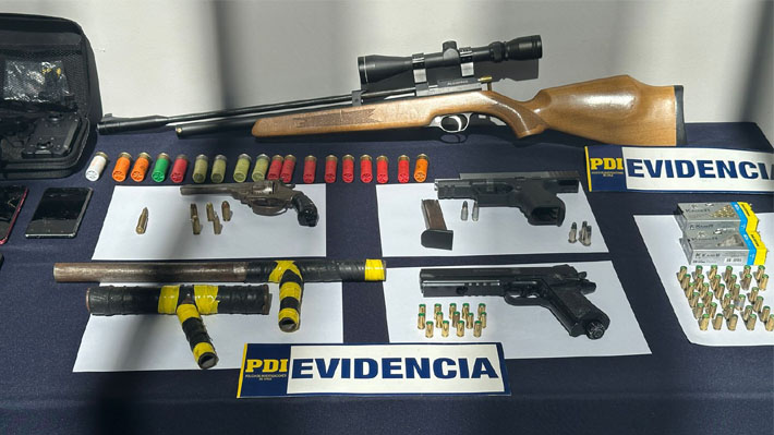 Las diligencias también incluyeron el allanamiento de dos inmuebles de la Villa Los Alcaldes de Máfil, donde se logró incautar cinco armas de fuego de tipo pistola, 135 cartuchos de distinto calibre, diversos equipos tecnológicos, un dron y 400 dosis de cocaína, además de otras especies.