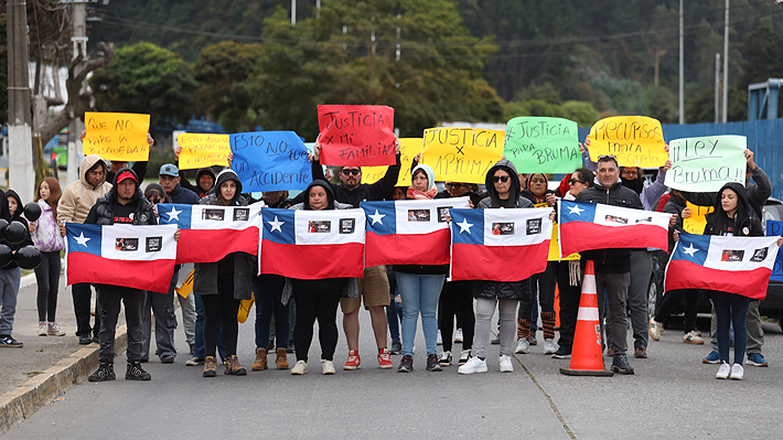Afuera de la Gobernación Marítima de Talcahuano, familiares de tripulantes de la "Bruma" desplegaron pancartas y banderas chilenas con los rostros de cada uno de los pescadores desaparecidos.