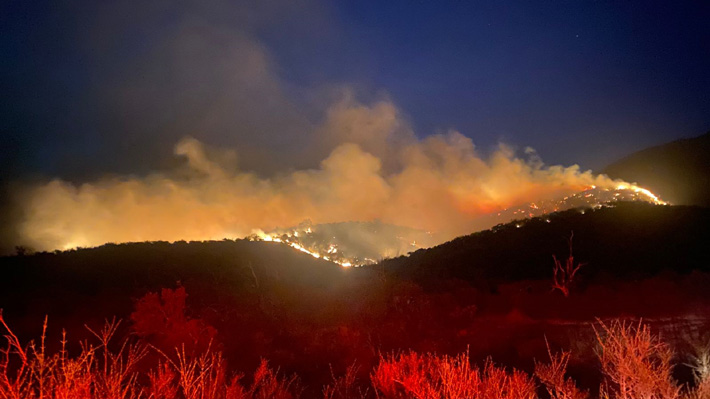 Según el último reporte de la Conaf, el incendio "no presenta amenazas a estructuras y se espera una disminución en su intensidad debido a las condiciones meteorológicas que se prevén para esta noche".