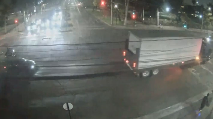 Un video muestra el momento exacto cuando un camión derribó postes en la intersección de las calles Padre Hurtado con Avenida Las Condes, en la comuna del mismo nombre.