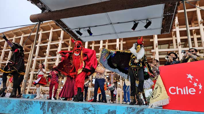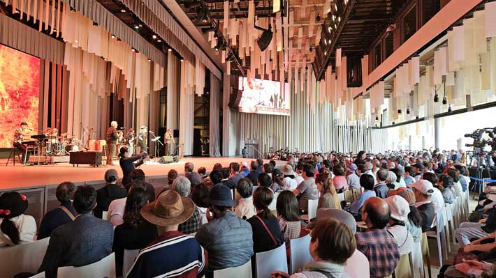 La jornada partió a las 11 de la mañana de Osaka en el National Day Hall, el especio especialmente construido para estos eventos, con un concierto de piano de Mahani Teave, que interpretó piezas de Violeta Parra y Chopin, que conmovieron al público presente. Luego, fue el turno del Bafona, que con bailes de cueca emocionaron a los chilenos residentes en el país del sol naciente.