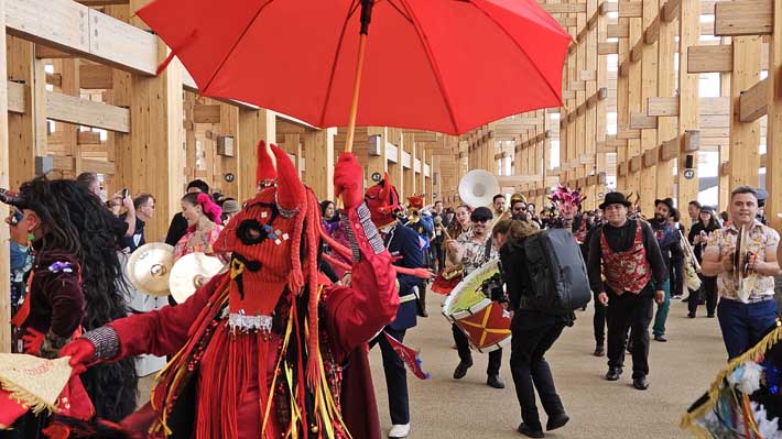 Luego del coctel, hubo un pasacalle bajo el gran anillo de madera –una de las atracciones de la Expo- que circunda todo el recinto ferial. El día se cerró con un concierto de la banda Congreso y la actuación del mago, Jean Paul Olhaberry.