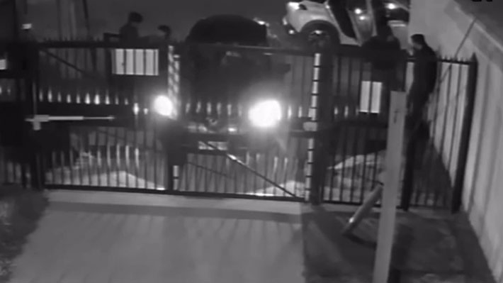 En la espera de la apertura del portón, aparece un automóvil del que se bajan tres sujetos. En imágenes se aprecia cómo