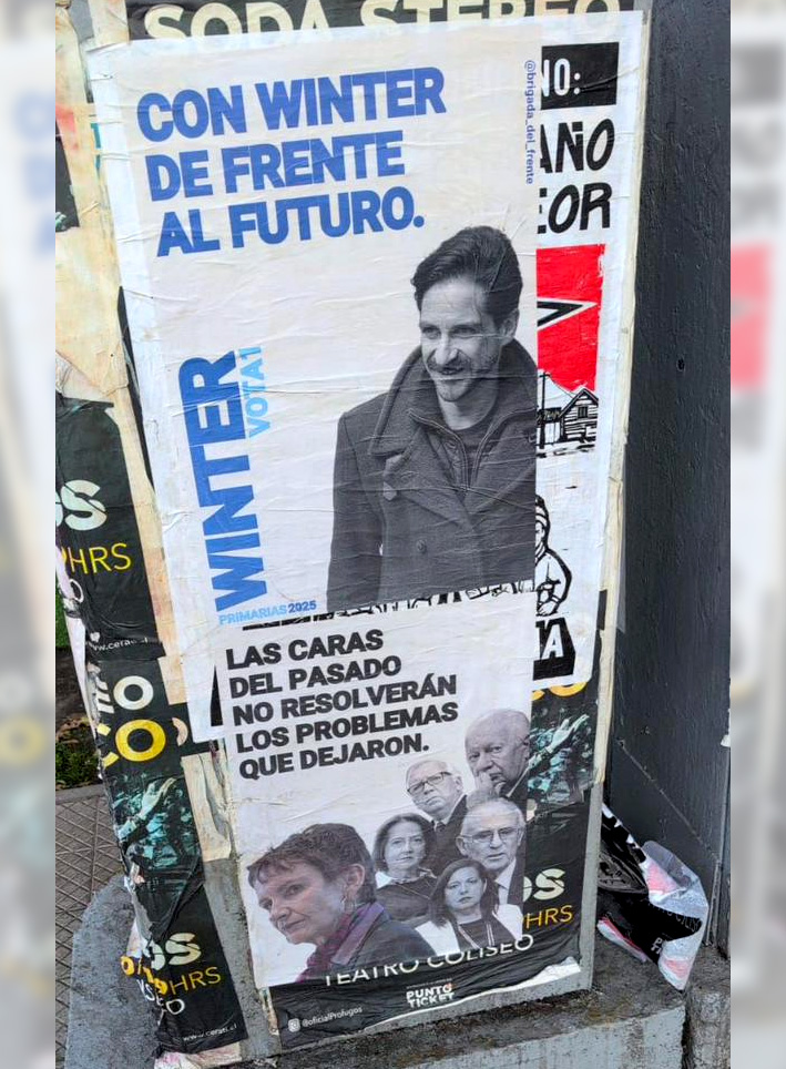 El póster llama a votar por Winter con la frase "Con Winter de frente al futuro" y más abajo otro cartel muestra fotos de Tohá, Vodanovic, el expresidente Ricardo Lagos, Sergio Bitar, Jorge Burgos y Soledad Alvear, sobre quienes se seala "las caras del pasado no resolverán los problemas que dejaron".