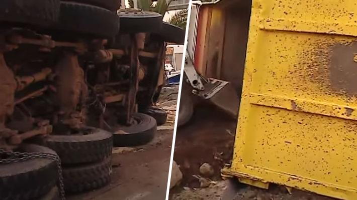 camión de carga se volcó luego de chocar contra un bus de RED que iba con pasajeros. El accidente ocurrió en la bajada de