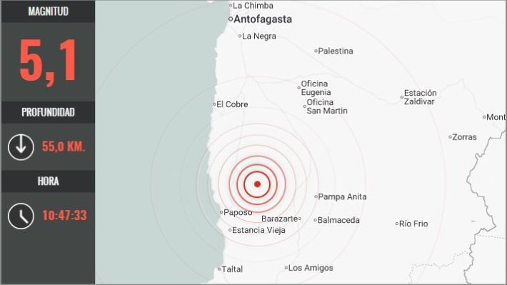 magnitud de 5,1 y su epicentro fue 37 kilómetros al noreste de Paposo, localidad ubicada en la comuna de Taltal.