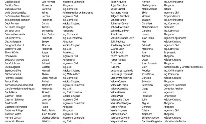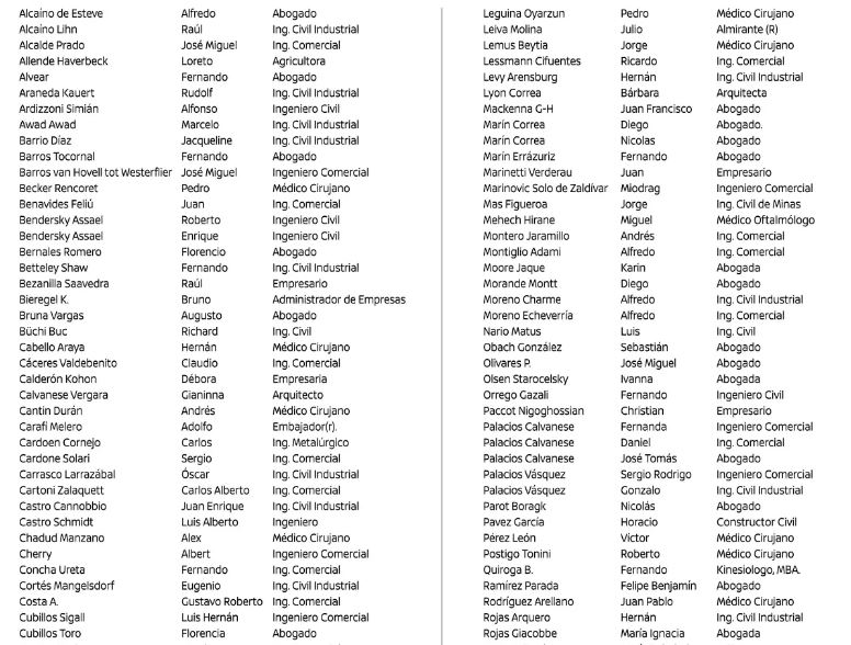 Los firmantes, entre los que están Hernán de Solminihac, exministro de Obras Públicas y Minería durante el primer periodo de Piñera; Alfredo Moreno, canciller en el mismo gobierno; Carolina Schmidt, titular de Medio Ambiente en el segundo periodo; y Gerardo Varela, ministro de Educación en 2018, los instaron a postergar "sus legítimos intereses" y poner "a Chile primero"
