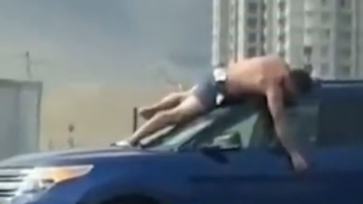 hombre semidesnudo sobre el capó de una camioneta, mientras una mujer la conducía por unos metros.