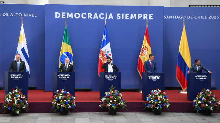 Desde el Patio de Los Cañones del Palacio de La Moneda, los líderes progresistas reunidos en la cumbre Democracia Siempre realizaron una declaración conjunta, manifestando, eso sí, matices en sus distintas alocuciones.