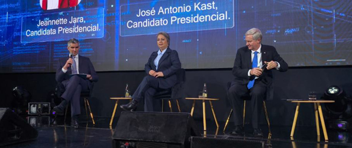 Jeannette Jara y José Antonio Kast en el foro organizado por la Confederación Nacional de Dueños de Camiones de Chile (CNDC) y la Asociación Nacional Automotriz de Chile (ANAC).