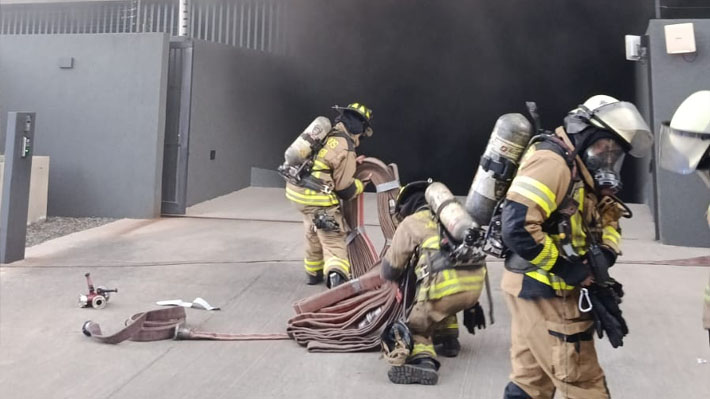 Voluntarios de Bomberos combaten un incendio que involucra a tres vehículos en el subterráneo de un edificio en la comuna de Las Condes, Región Metropolitana.