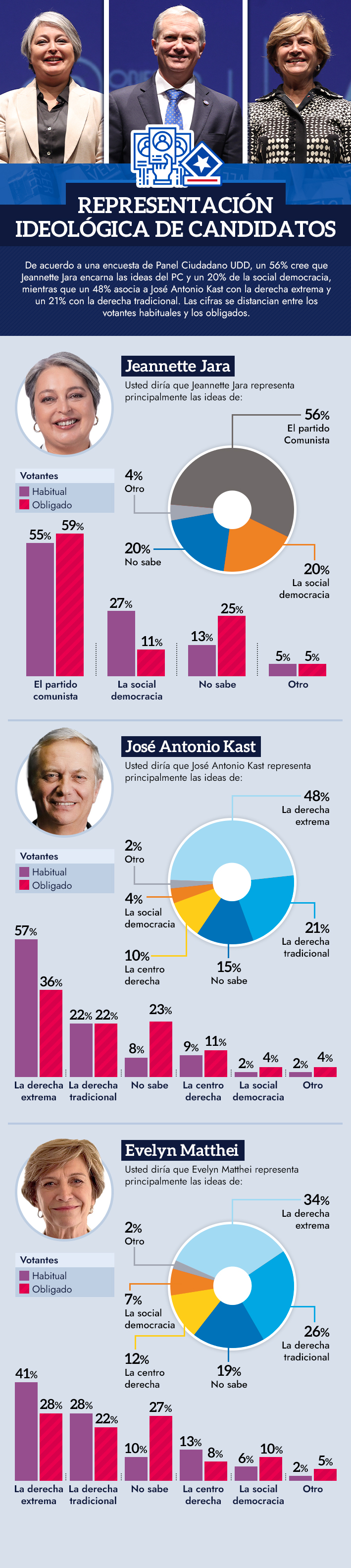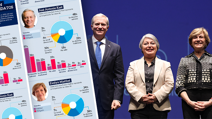 Según una encuesta de Panel Ciudadano UDD, un 56% dice que Jeannette Jara representa las ideas del PC y sólo un 20% las de la social democracia, mientras que un 48% ubica a José Antonio Kast en la derecha extrema.