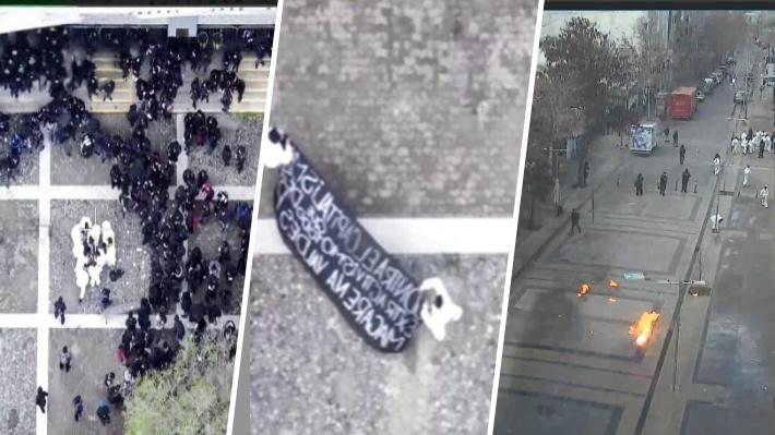 Cerca de 40 encapuchados -algunos de ellos vestidos con overoles- salieron desde el Instituto Nacional (IN) y lanzaron aproximadamente 30 molotov y fuegos artificiales al personal Control de Orden Público (COP) de Carabineros.