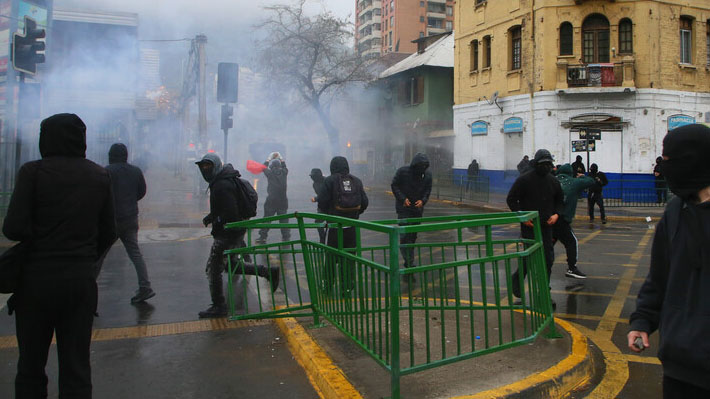 De acuerdo con información policial, un grupo de encapuchados lanzó fuegos artificiales contra funcionarios de Control de Orden Público (COP) de Carabineros en intersección de la Alameda con la calle Nataniel Cox.