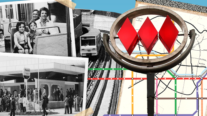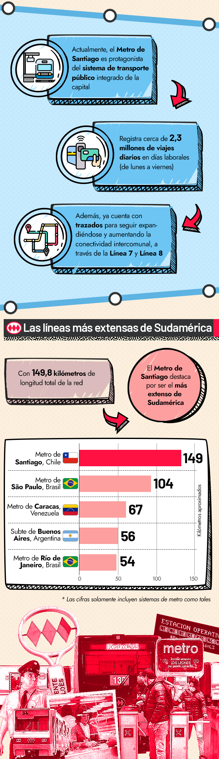 Fotografías: Metro de Santiago | Mapa base: B1mbo, Wikimedia | Iconos: Freepik y vvstudio en Freepik