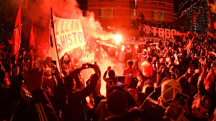 Hinchas de la Universidad de Chile realizan banderazo en el frontis del hotel.