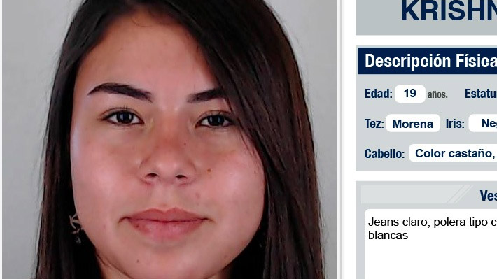 Krishna Francisca Aguilera Yáñez, de 19 años, se encuentra desaparecida hace 10 días, a quien se le perdió el rastro cuando viajaba desde San Bernardo a la comuna de Santiago.