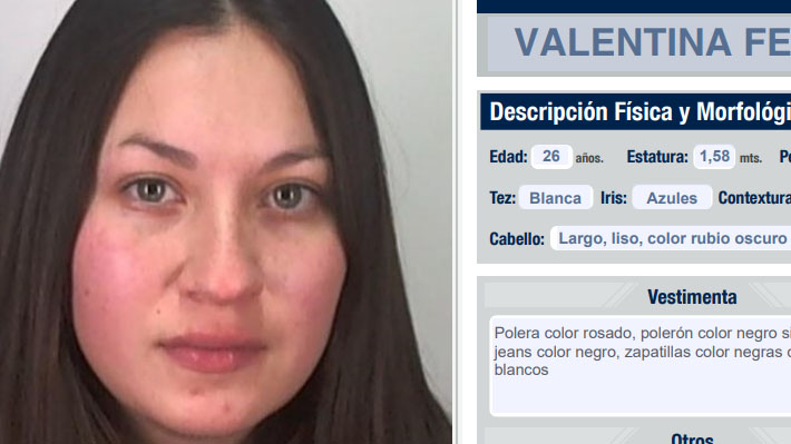 La Policía de Investigaciones (PDI) emitió una ficha de la joven. En el documento se lee que vestía "polera color rosado, polerón color negro sin mangas, jeans color negro, zapatillas color negras con detalles blancos".