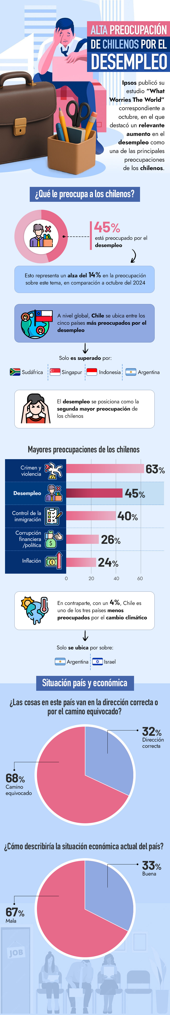 Encuesta ubica a Chile entre los cinco países más preocupados por el desempleo