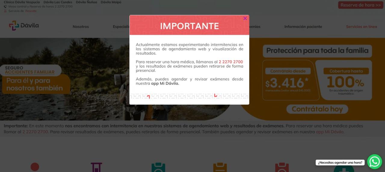"Actualmente estamos experimentando intermitencias en los sistemas de agendamiento web y visualización de resultados" dice un anunció al entrar a la página web de la Clínica Dávila, la cual sufrió un hackeo la tarde de este jueves.