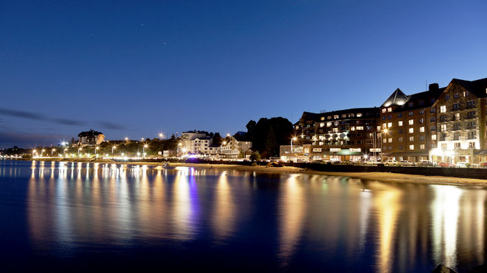 Postal nocturna de Puerto Varas en la orilla del Lago Llanquihue.