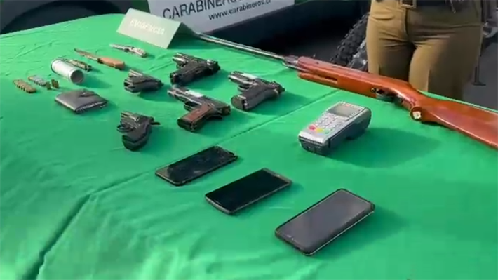 Entre lo hallado hay tres teléfonos celulares, un cuchillo cocinero, dos cortaplumas, cuatro pistolas a fogueo, un rifle a postones, un equipo Transbank, un revólver a fogueo, una vaina percutada CS.37, siete municiones a fogueo sin calibre, nueve municiones a fogueo calibre 9 mm., una munición de fogueo calibre 8mm. y 3 vainas calibre 9 mm percutadas.