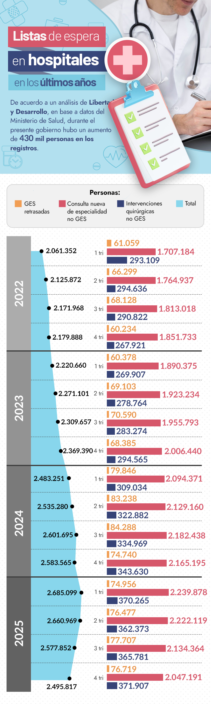 Según un análisis de Libertad y Desarrollo, en base a datos del Minsal, hubo un aumento del 21% desde el primer semestre de 2022 al último del año pasado.