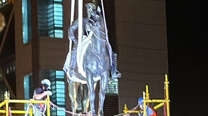 Pasada la medianoche, el monumento fue trasladado en un camión desde el Museo Histórico Militar, donde se encontraba desde marzo de 2021 para ser restaurado luego de sufrir diversos daños en el marco de las manifestaciones tras el estallido social de 2019.
