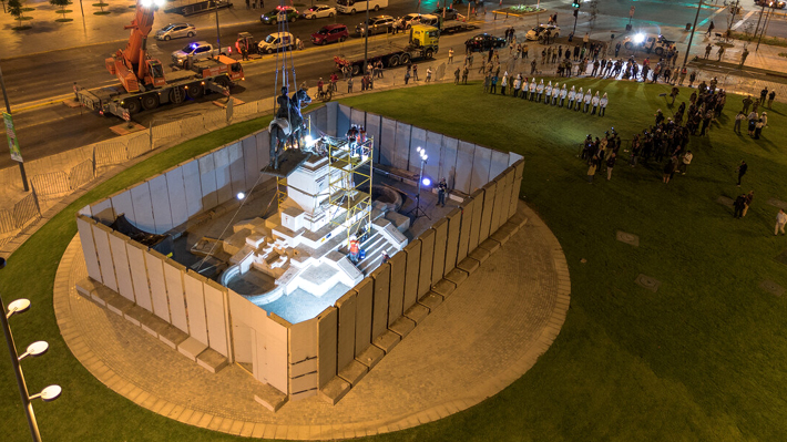 Durante cinco años estuvo fuera de Plaza Italia la estatua del general Baquedano, que durante la madrugada de este martes regresó a su plinto en medio de una ceremonia nocturna donde el Ejército le rindió honores.